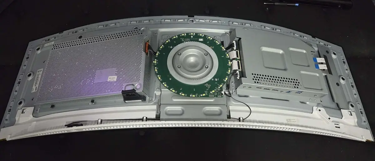 With the back off, you’ll see a circular green board with 6–7 screws between the green board and the metal shield underneath. These hold the shield and T-Con area underneath.