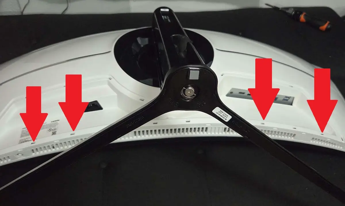 - Locate the small indentations where plastic clips are hooked at the bottom of your monitor. Bottom of the monitor referred to where your ports are located.