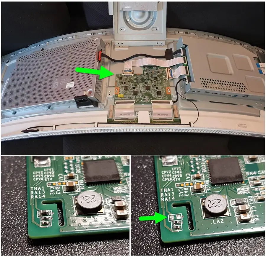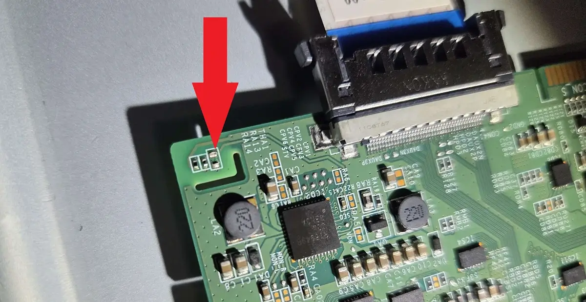 You’re now staring at the T-Con board, and you should see the thermistor, a tiny component labeled THA1, near test points RA13 and RA14.