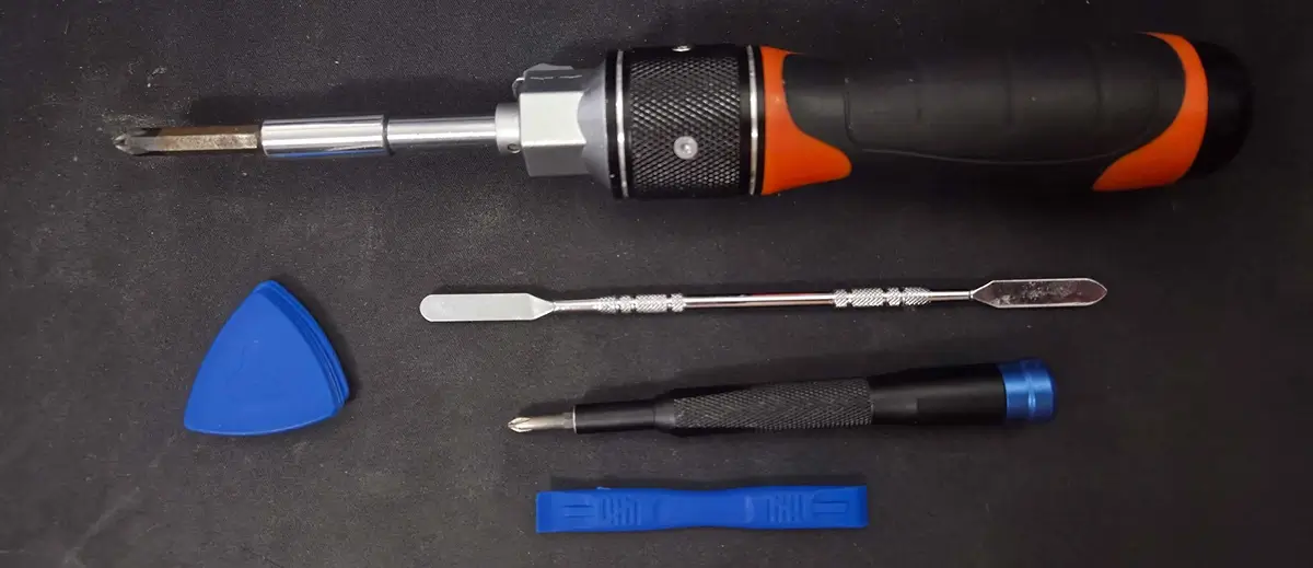 Don’t worry if you don’t have a kit, a couple of screwdrivers, a plastic card/guitar pick, and tweezers will work in a pinch.